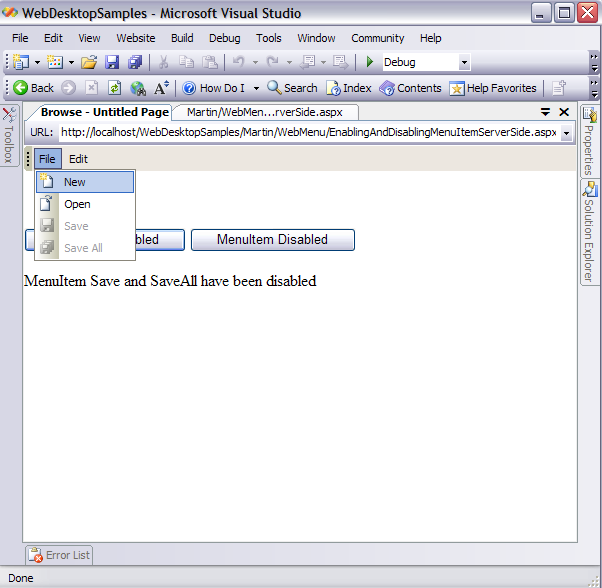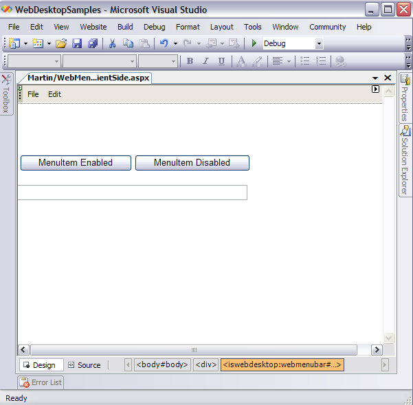 - Drag WebMenu, HTML Buttons, and HTML Text from Toolbox into a WebForm page. Named the html Buttons "MenuItem Enabled" and "MenuItem
