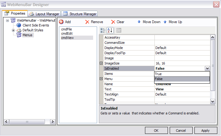 WebMenu gives you a flexibility to customize MenuItem where you can freely set MenuItem Collection to be enabled or disabled according to your needs. This tutorial will give a step-by-step guidance on how to enable and disable MenuItem using Designer, Server-Side Event, and Client-Side Event.