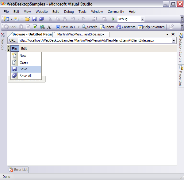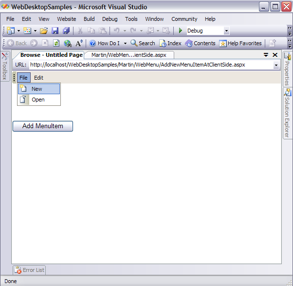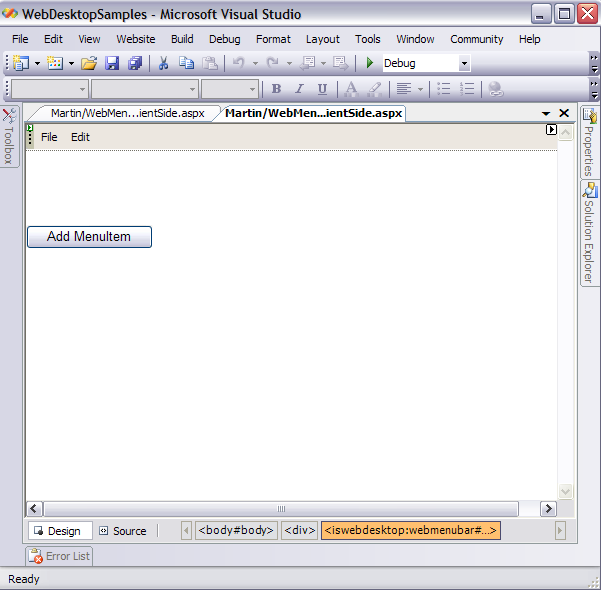 - Drag WebMenu and HTML Button from Toolbox into a WebForm page. Named the HTML button "Add MenuItem"