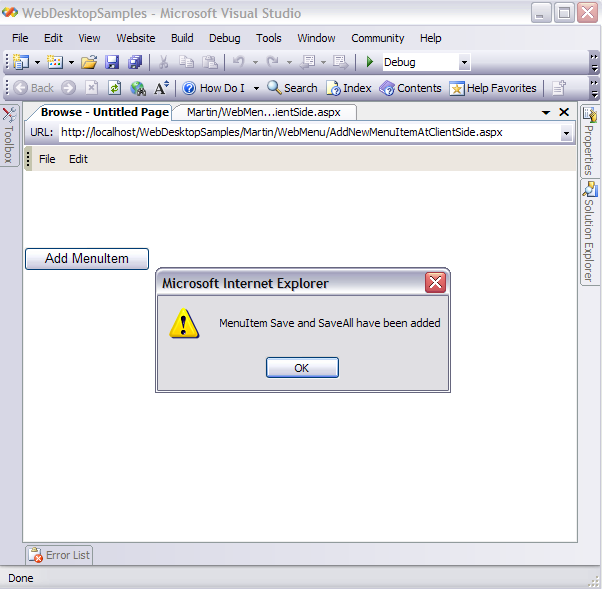 - Click the "Add MenuItem" button and it will display an Alert box.