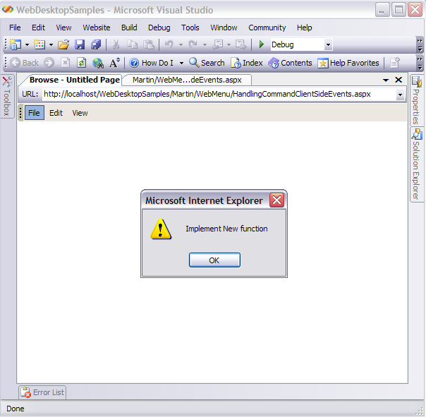 Copy Code<script language="javascript" type="text/javascript"> function OnMenuCommands(controlId, menuCommand) { if(menuCommand.Text == "File") { if(menuCommand.SelectedMenuItem != null) { var mi = menuCommand.SelectedMenuItem; ExecCommand(mi.Text); } } } function ExecCommand(commandText) { switch (commandText) { case "New": alert("Implement New function"); break; case "Open": alert("Implement Open function"); break; } } </script>