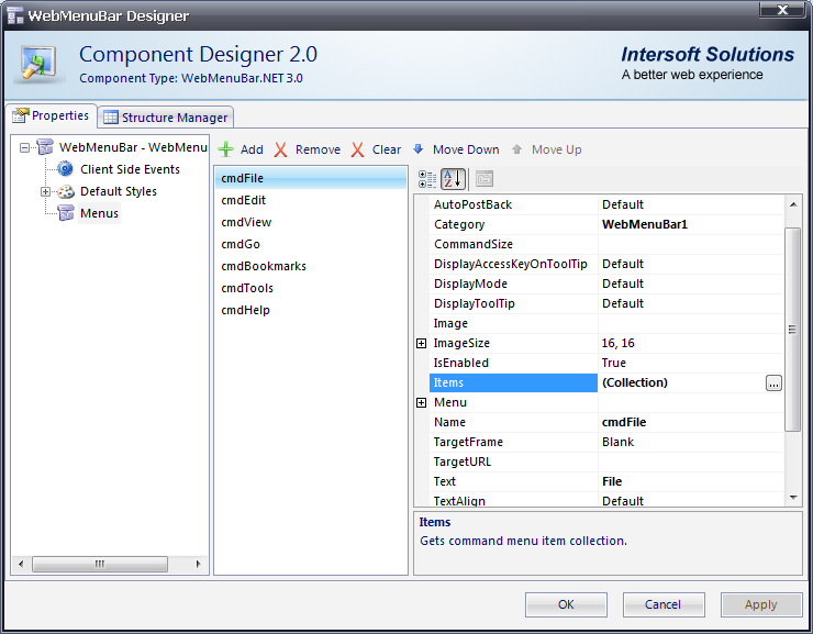 - In Items property on Menus node, click the Collection button. It will bring you to the WebMenuBarItem Collection Editor box.