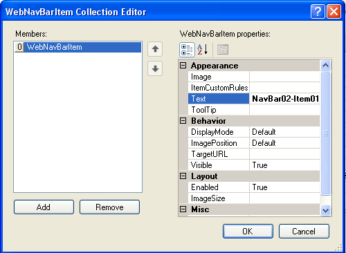 - To add the BarItem go to Items Collection to show WebNavBarItem Collection Editor.