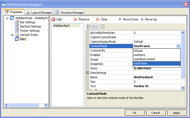 - On Bar SubCategory Add new NavBar and fill the information about the new Bar. Make sure you change the ContentMode to UseIFrame and specify the