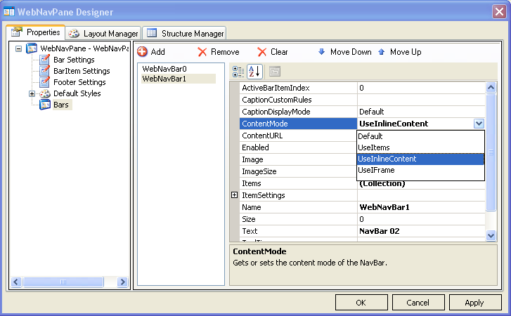 - Add another NavBar and fill the information about the new Bar. This time change the ContentMode to UseInlineContent.