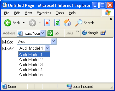 - Run the page. Select a value from ddlMake and data will be populated in ddlModel without causing full page postback.