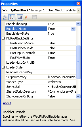 Properties Values ServiceType WebForm ServiceUrl The URL path of the page (in this case, the path is ~/test/ConvertStandardControls.aspx) EnableUIMode True PostInputControls True PostViewState True