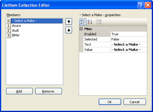 - Run the page. Selecting a value from ddlMake will populate data in ddlModel without causing full page postback.