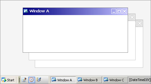 The TaskBar reflects the open windows and manages the entire window system in real-time, so that any newly created window will be shown immediately in the TaskBar as well as closed Window. This also applies to window that dynamically created or closed through codes (API). |
