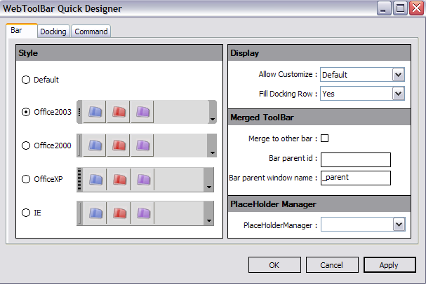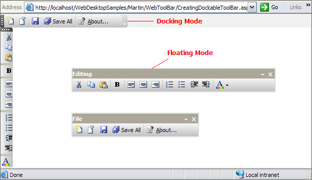 WebToolBar can be configured as docking and floating. For Docking mode, it allows you to freely customize the docking position of WebToolBar in the PlaceHolderManager, such as left, right, top and bottom. For Floating mode, it allows you to set the WebToolBar to be floated whenever you drag the WebToolBar.