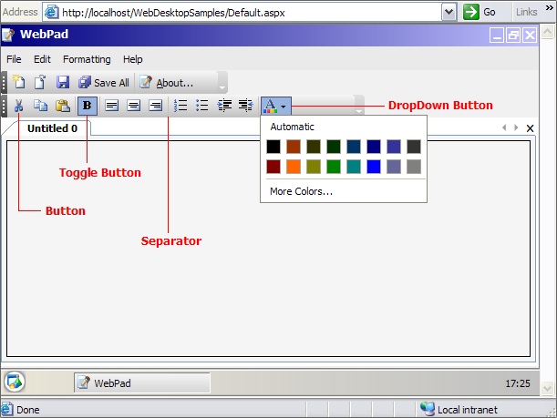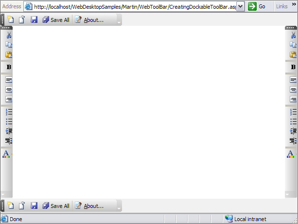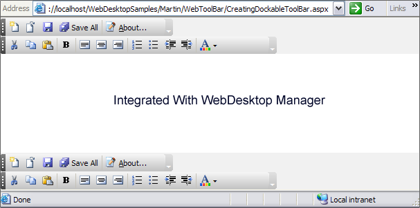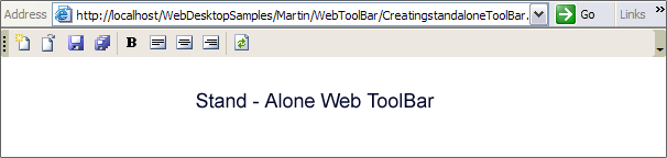 WebToolBar is one of essential member in WebDesktop.NET which allows you to create rich toolbar functions in the rich styles and behaviors of desktop's ToolBar. WebToolBar offers a set of advanced and unique features such as in the following: