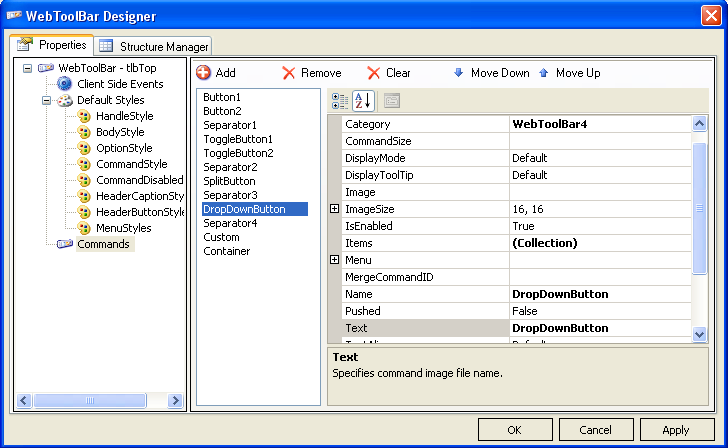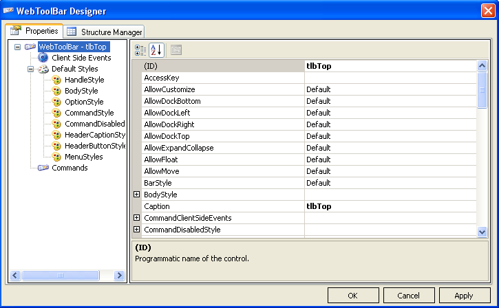 WebToolBar Designer is the common designer that Intersoft Component has, and also the complete designer which used to handle all property management of WebToolBar. In addition, the structure of WebToolBar can also be managed using StructureManager.