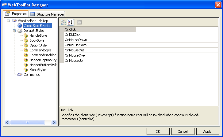 Note: when using the WebToolBar Designer you can not use the automatic function generation, to generate WebToolBar ClientSide Events.