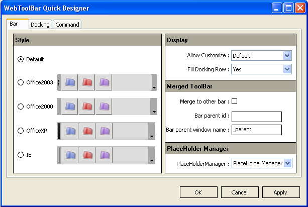 This category focus on WebToolBar merging capability. You can configure the merging settings from this designer. - PlaceHolderManager