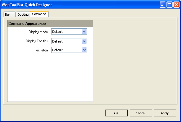 Command Tab focus on Command Type's Appearance, you can set the General settings for all CommandTypes of WebToolBar. The settings include Display Mode, Display ToolTips, and Text Alignment.