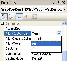 To enable WebToolBar's Customization, you need to set the property AllowCustomize to "True"