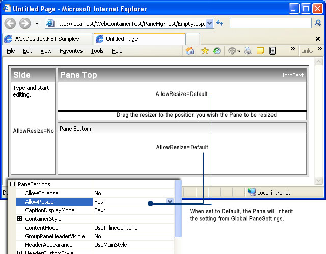 In above illustration, The "Side" and "Pane Top" can't be resized vertically because the "Side" Pane has its AllowResize set to No which affect its next sibling although the "Pane Top" is configured to use Default (in this case Yes since its Global PaneSettings is Yes). However, the horizontal resizing between "Pane Top" and "Pane Bottom" can be performed as desired.