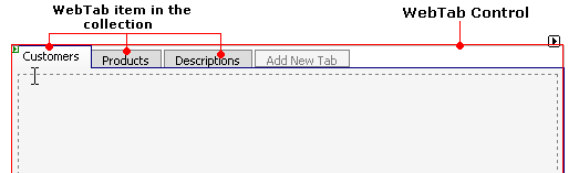 The WebTab object represents the main operational area which contains a collection of tab items. You can add as many tab items as you like into this collection, you can even configure it globally through the main WebTab object, or set it individually through each item's property.