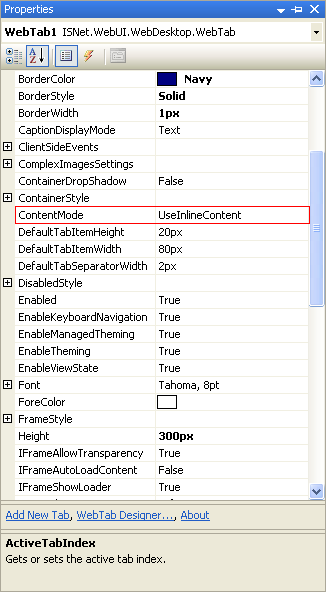 For example, In the WebTab object's property, we set the ContentMode into "InlineContent", which means by default, all of the Tab Items in the collection will have "InlineContent" as the default ContentMode. You can still configure each individual TabItem from the designer (WebTab Designer).