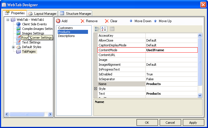 WebTab's main property is shown in picture 1. In WebTab1, we have a collection of Tab Items which consists of "Customers", "Products", and "Description" Tab.