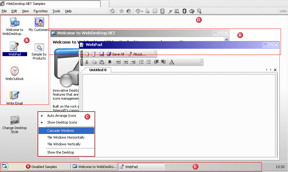 The WebDesktopManager introduces new user interface concepts modelled on today's popular desktop. WebDesktopManager exposes 5 user interface concepts such as illustrated in the following screenshot.