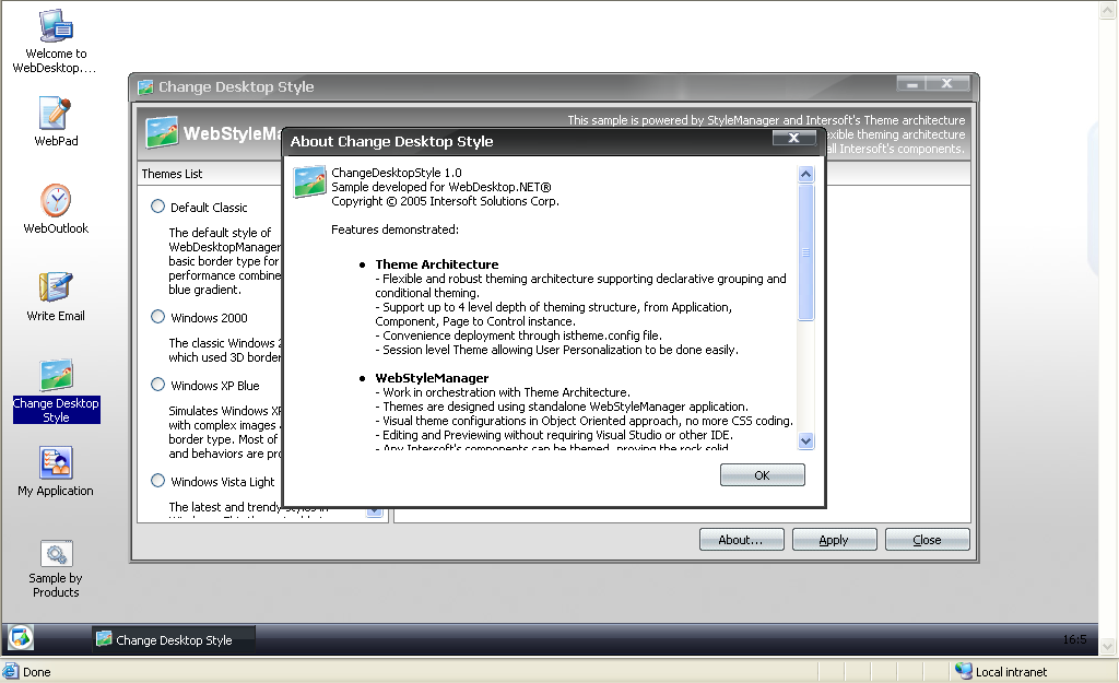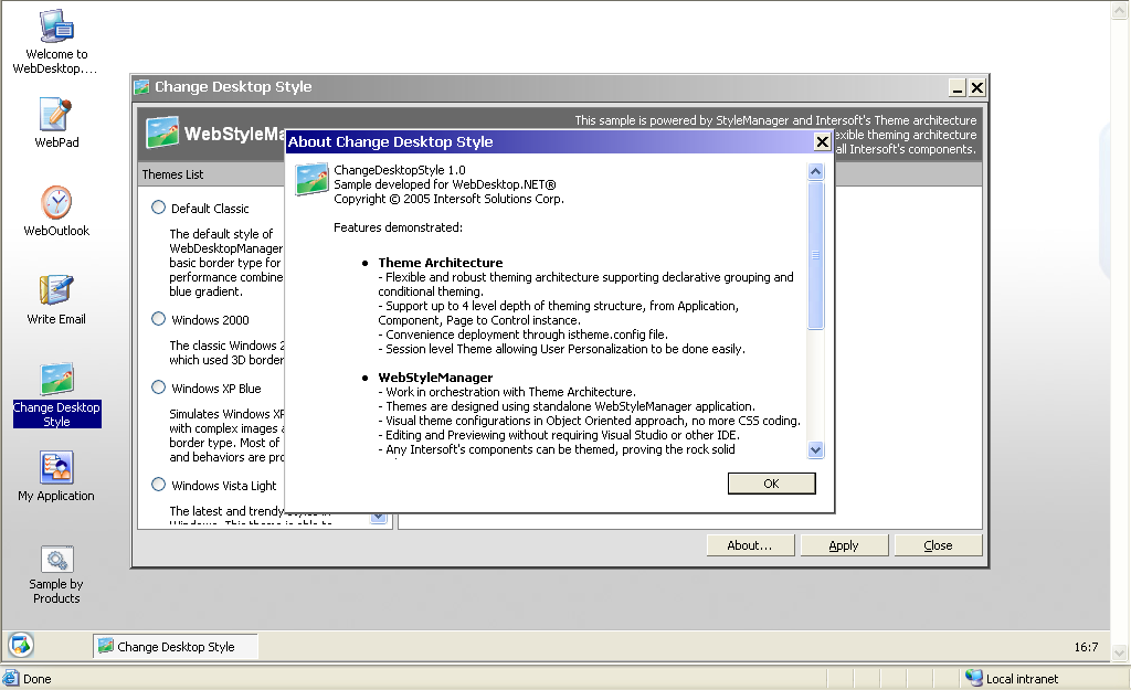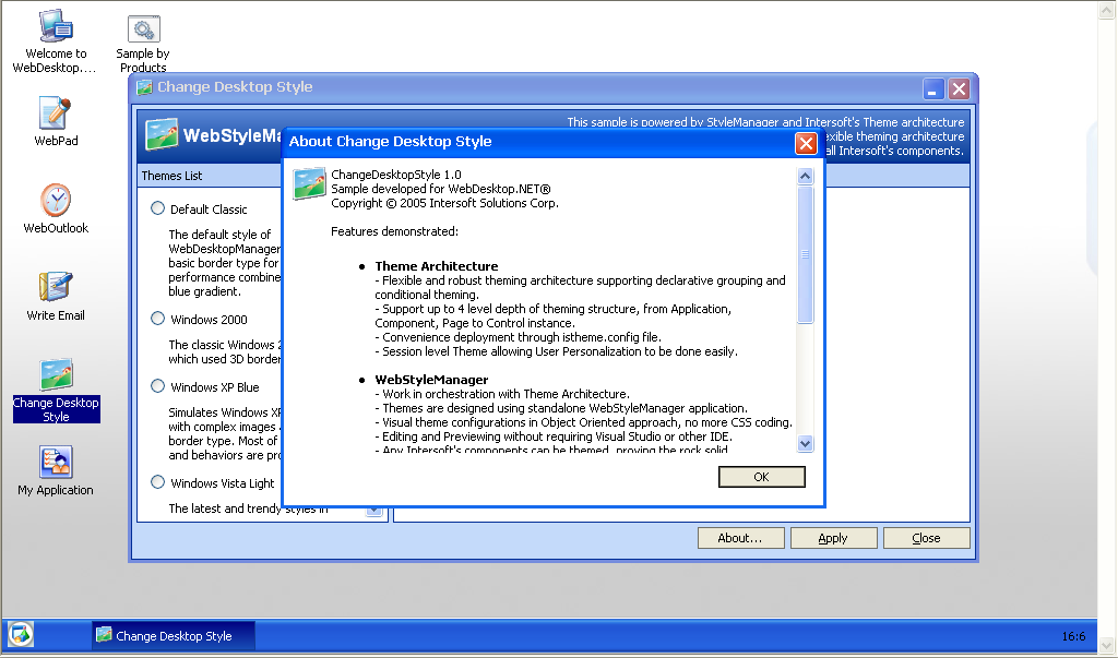 When the WebDialogBox is integrated, the Window and Button styles of WebDialogBox will be inherited from from WebDesktop. Therefore the consistent look and feel of all WebDialogBox can be maintained through out the entire application.