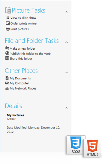 In version 4, WebExplorerPane has been refined to fully support the latest web standards. This allows you to use many of the WebExplorerPane features in your next-generation web applications and at the same time leveraging cutting-edge technologies such as HTML5 and CSS3.