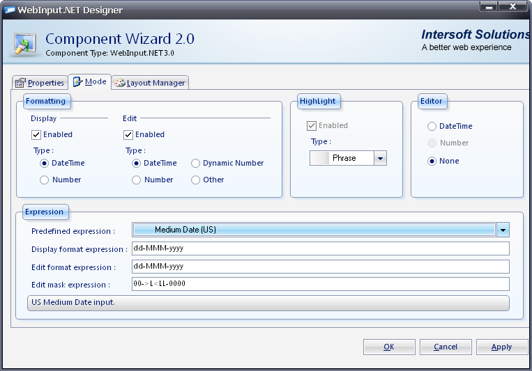 - In the Mode Tab, set the Predefined expression properties to Medium Date (US).