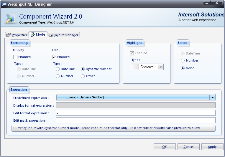 - In the Mode Tab, set the Predefined expression properties to Currency (DynamicNumber).