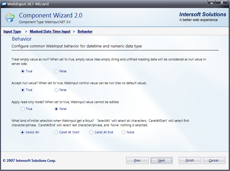 - This section is called Behavior. In here, you will be able to configure common WebInput's behavior related to DateTime and numeric data type. Click Next to go to next section.