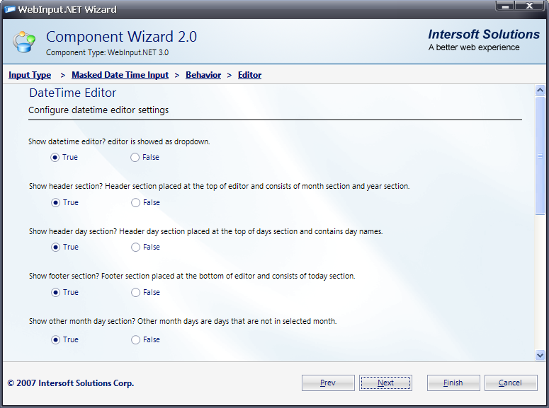 - This section is called Editor. In here, you will be able to configure DateTime editor settings. For example: set Show datetime editor to True. Click Next to go to next section.