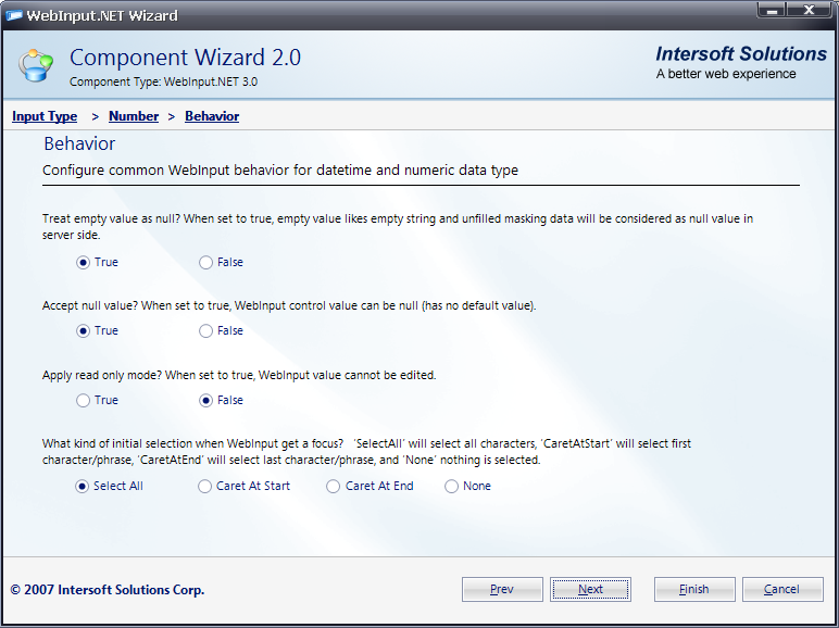 - This section is called Behavior. In here, you will be able to configure common WebInput's behavior related to DateTime and numeric data type. Click Next to go to next section.