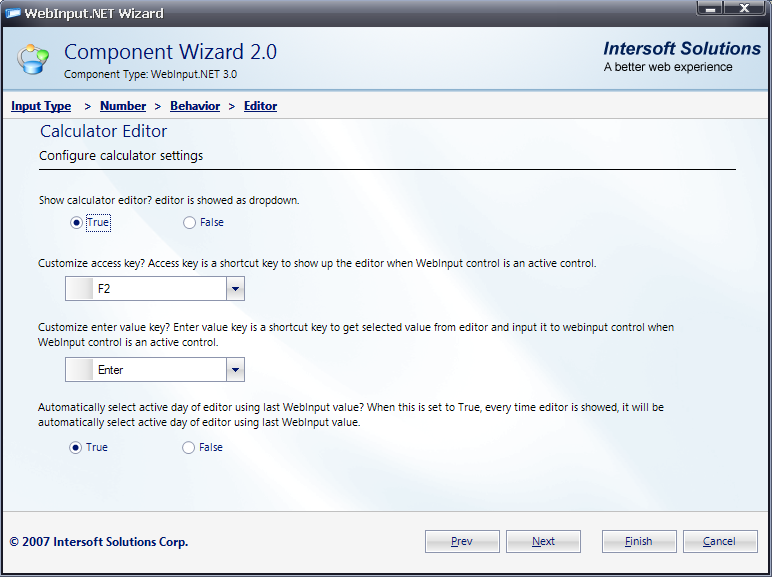 - This section is called Editor. In here, you will be able to configure calculator editor settings. For example: set Show calculator editor to True. Click Next to go to next section.
