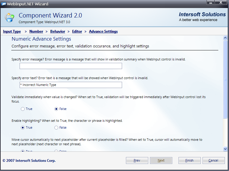 - The final section is called Advance Settings. In here, you will be able to configure error message, error text, validation occurance and highlight settings. For example: set the error message as "* Incorrect Numeric Type". Click Finish to apply the settings.