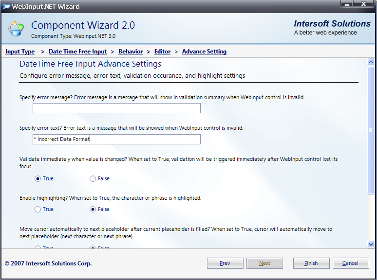 - The final section is called Advance Settings. In here, you will be able to configure error message, error text, validation occurance and highlight settings. For example: set the error message as "* Incorrect Date Format". Click Finish to apply the settings.