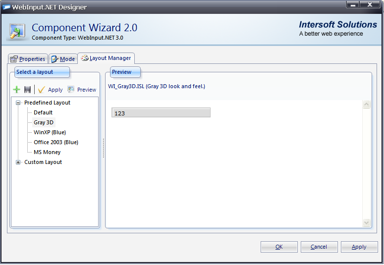By default, WebInput.NET is equipped with 5 predefined layouts, such as 'Default', 'Gray 3D', 'WinXP (Blue)' etc..