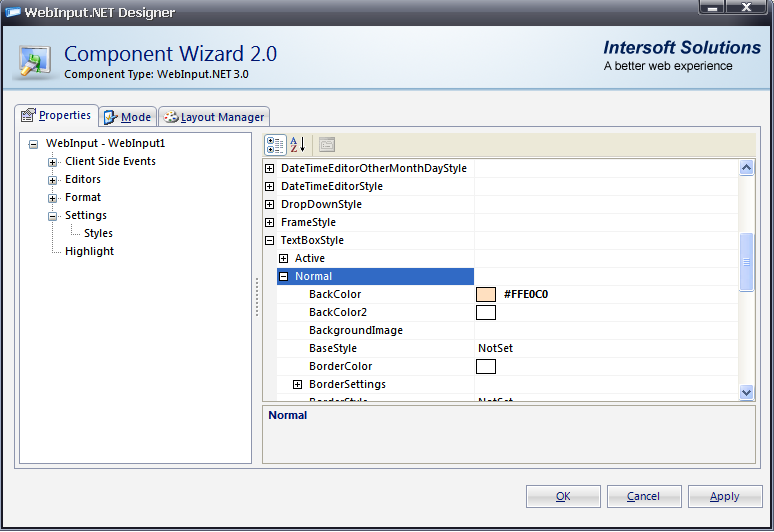 - Try to modify the TextBoxStyle - Normal - BackColor into #FFE0C0 using WebInput.NET Designer >> Settings >> Style. This style will be saved into an *.isl file.
