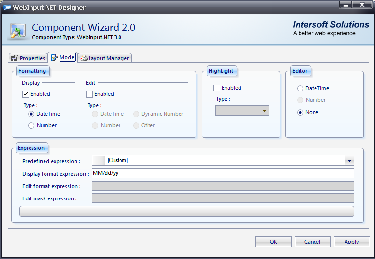 - Go to Mode tab and select Enabled checkbox in Display section and set Display Format Expression to "MM/dd/yy".