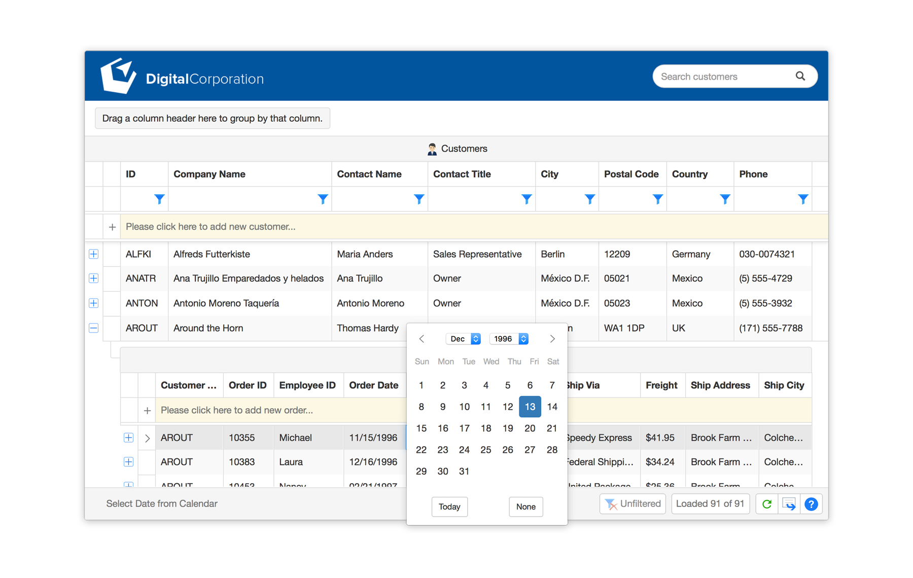 Meet the all-new, gorgeous modern theme for WebGrid. Right when you apply the new unified theme, your existing WebUI apps will never look the same way anymore. Every user interface element has been meticulously redesigned with natural colors, spacious layout, larger fonts and retina-sharp SVG icons.
