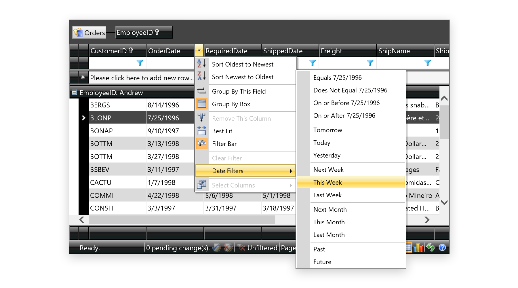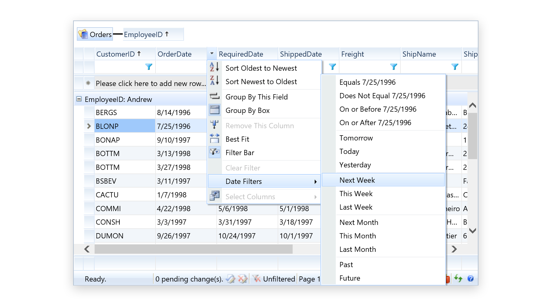 Since its initial release, WebGrid has provided predefined filter types that lets users easily perform filters from the WebGrid user interface. Some of the supported predefined filters are greater than or equal to, greater than, equal to, like, between, empty, null , and more. Try the live demo