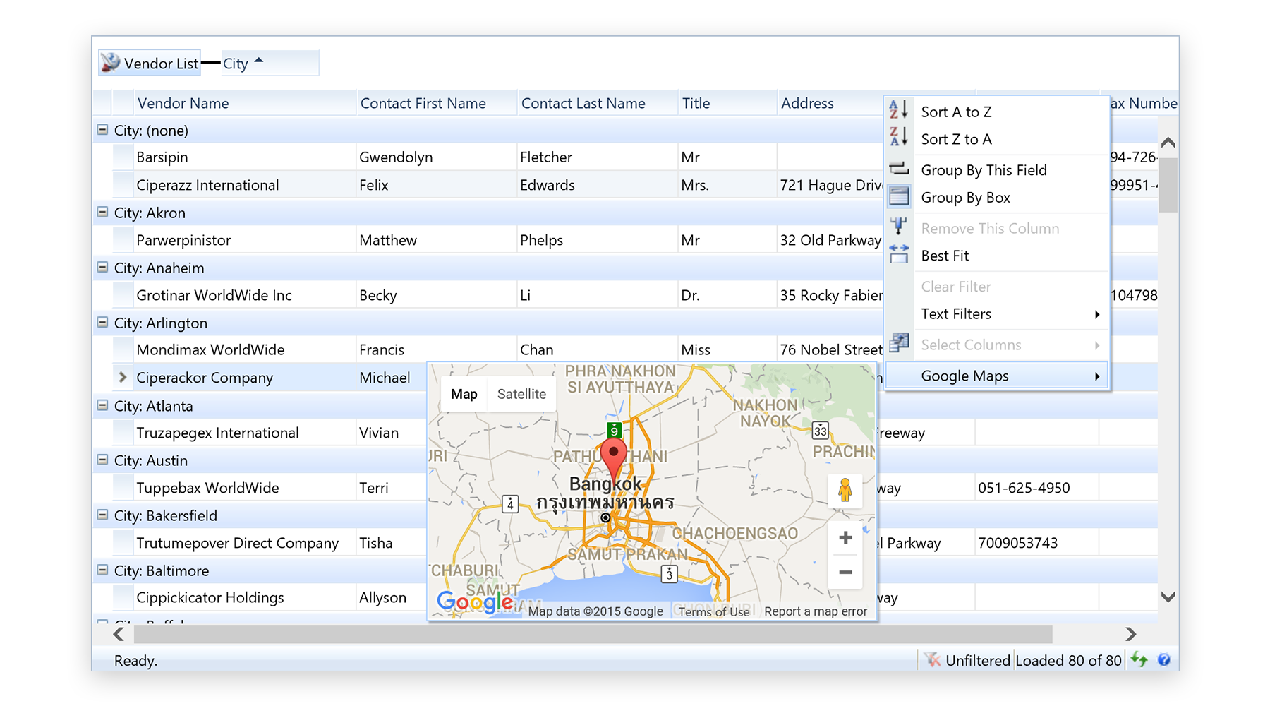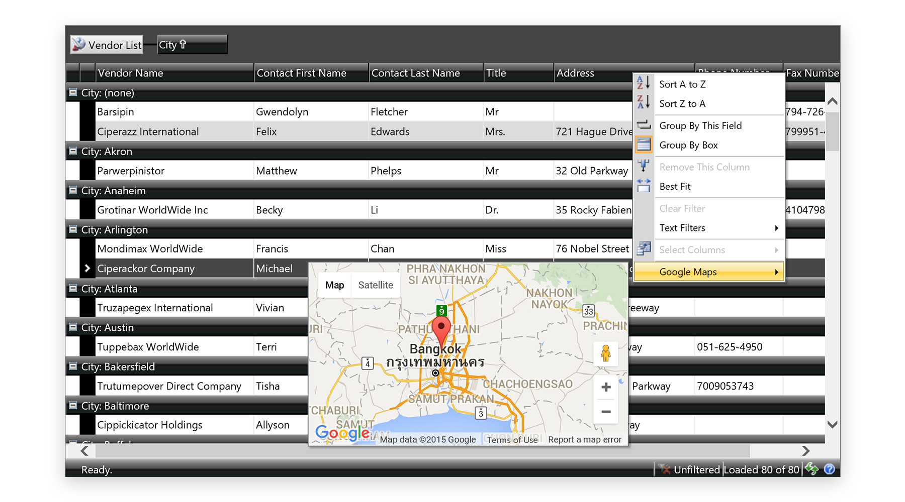 The menu below illustrates a Google Maps option in a WebGrid contextual menu.