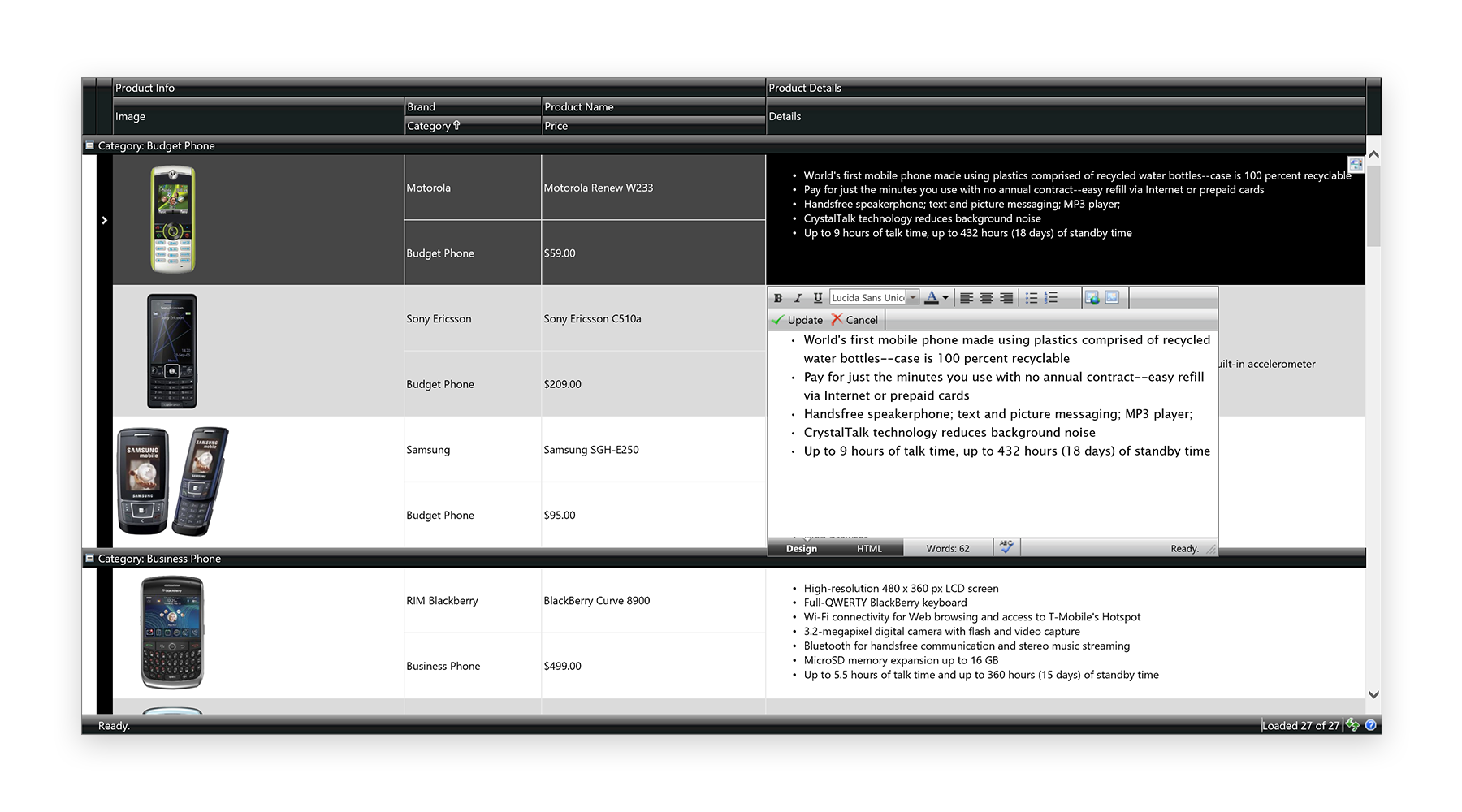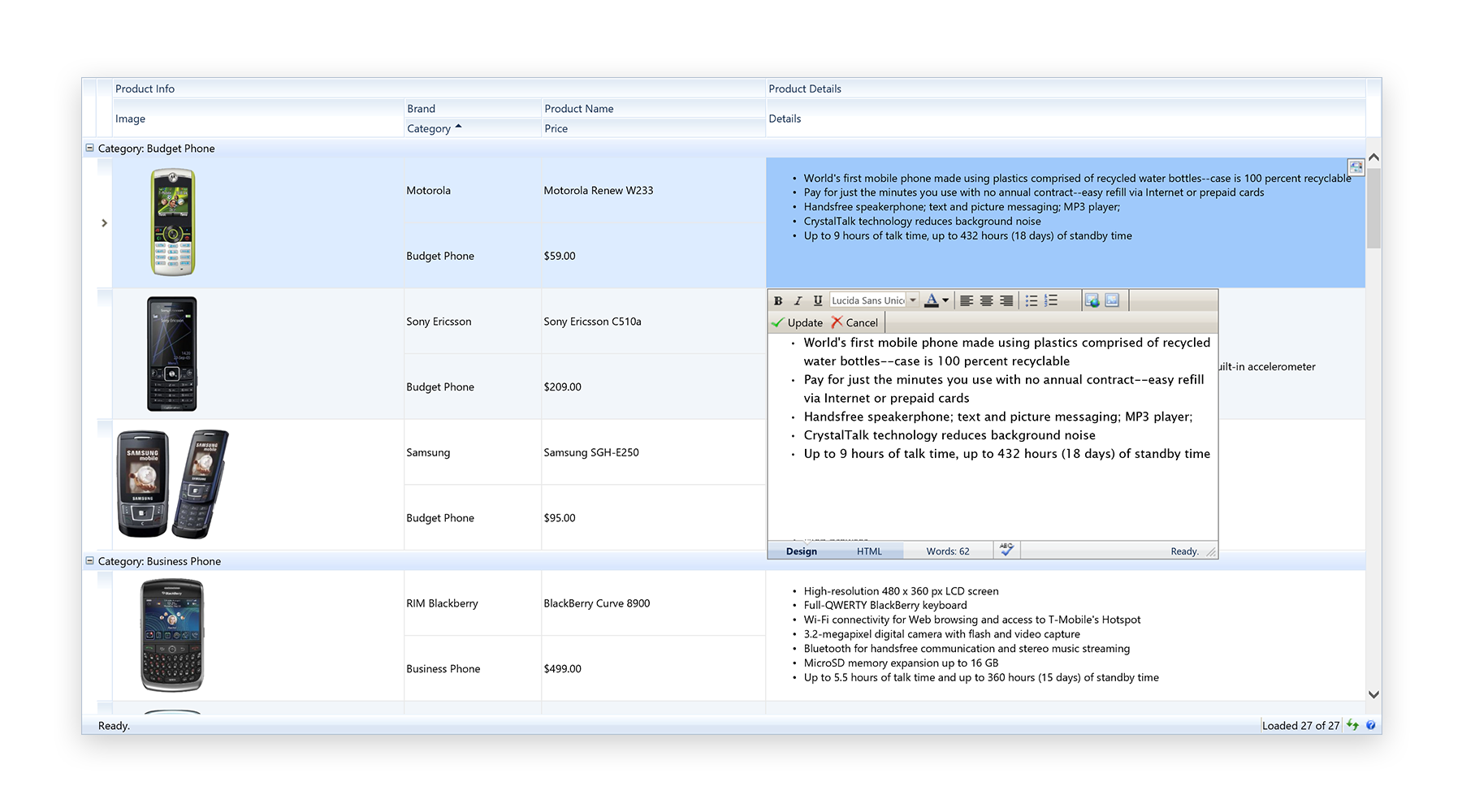 WebGrid now supports an integrated WebTextEditor, enabling users to leverage the powerful and advanced editing capabilities of WebTextEditor with the convenience of one-click inline editing. Try the live demo
