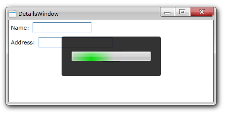 <Intersoft:UXWindow xmlns="http://schemas.microsoft.com/winfx/2006/xaml/presentation" xmlns:x="http://schemas.microsoft.com/winfx/2006/xaml" xmlns:Intersoft="http://intersoft.clientui.com/schemas" Header="DetailsWindow"> <Intersoft:UXWindow.BusyIndicatorTemplate> <DataTemplate> <Border CornerRadius="4" Width="200" Height="80" Background="#CC000000"> <Intersoft:UXProgressBar Width="160" Height="20" HorizontalAlignment="Center" IsIndeterminate="True"/> </Border> </DataTemplate> </Intersoft:UXWindow.BusyIndicatorTemplate> <Grid x:Name="LayoutRoot"> <StackPanel Orientation="Vertical"> <StackPanel> <Intersoft:FieldLabel Header="Name: "> <Intersoft:UXTextBox Width="120"/> </Intersoft:FieldLabel> <Intersoft:FieldLabel Header="Address: "> <Intersoft:UXTextBox Width="150"/> </Intersoft:FieldLabel> </StackPanel> <Intersoft:UXButton Name="SaveButton" Content="Save" HorizontalAlignment="Center" Click="SaveButton_Click" /> </StackPanel> </Grid> </Intersoft:UXWindow> |