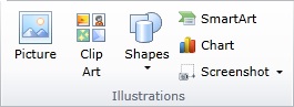 <Intersoft:UXRibbonTabGroup x:Name="tab2Group3" Header="Illustrations" Icon="/assets/icons/illustration.png"> <Intersoft:UXRibbonButton Content="Picture" MinimumSize="Large" LargeIcon="/assets/icons/picture.png" /> <Intersoft:UXRibbonButton Content="Clip Art" MinimumSize="Large" LargeIcon="/assets/icons/clipart.png" /> <Intersoft:UXRibbonDropDownButton Content="Shapes" MinimumSize="Large" LargeIcon="/assets/icons/shapes.png" /> <Intersoft:UXRibbonButton Content="SmartArt" Icon="/assets/icons/smartart.png" LargeIcon="/assets/icons/smartart.png" /> <Intersoft:UXRibbonButton Content="Chart" Icon="/assets/icons/chart.png" LargeIcon="/assets/icons/chart.png" /> <Intersoft:UXRibbonDropDownButton Content="Screenshot" Icon="/assets/icons/screenshot.png" LargeIcon="/assets/icons/screenshot.png" /> </Intersoft:UXRibbonTabGroup> |