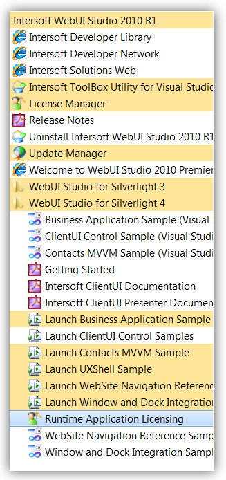 You can locate the application from the program group according to your application platform. For example, to license a Silverlight 4 application, locate the Runtime Application Licensing for Silverlight 4 from the following program grou path: Start Menu, All Programs, Intersoft WebUI Studio 2010 R1, WebUI Studio for Silverlight 4.