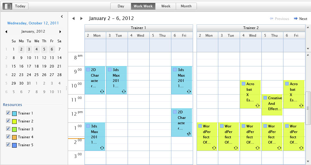 <Intersoft:UXScheduleView DisplayDate="1/2/2012" EventsSource="{Binding Events}" CategoriesSource="{Binding Categories}" ResourcesSource="{Binding Resources}" GroupBy="Resources"> <Intersoft:UXScheduleDayView/> <Intersoft:UXScheduleWorkWeekView IsActive="True"/> <Intersoft:UXScheduleWeekView/> <Intersoft:UXScheduleMonthView/> </Intersoft:UXScheduleView> |
