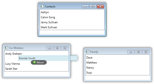 In addition to the enhanced controls, ClientUI 5 also includes numerous enhancements to its core libraries such as the navigation and drag-drop framework. All controls that are built upon the drag-drop framework now supports cross windows in WPF. This means that you can now drag an item from a window and drop it to a valid object in another window such as shown in the following illustration.