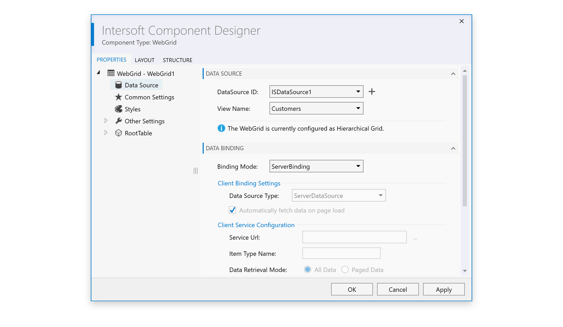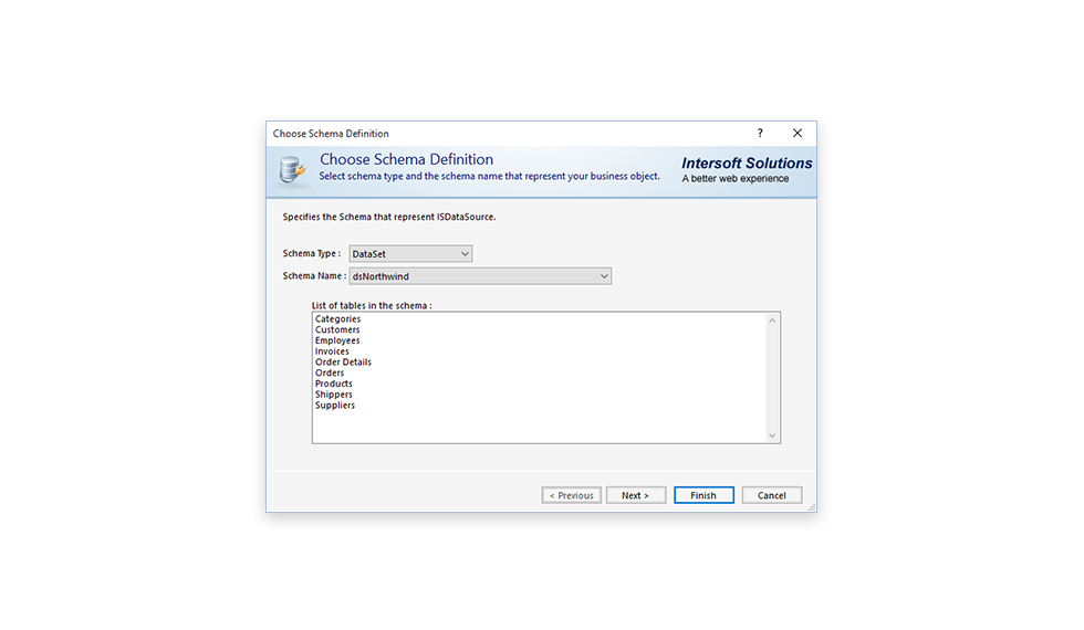 The multiple table support of ISDataSource is used extensively in both WebGrid and WebScheduler. Both Intersoft products rely heavily on multiple table support to extend their features. Optimized to support their specific needs, ISDataSource connects perfectly to Intersoft databound controls such as WebCombo, WebGrid, and WebScheduler.