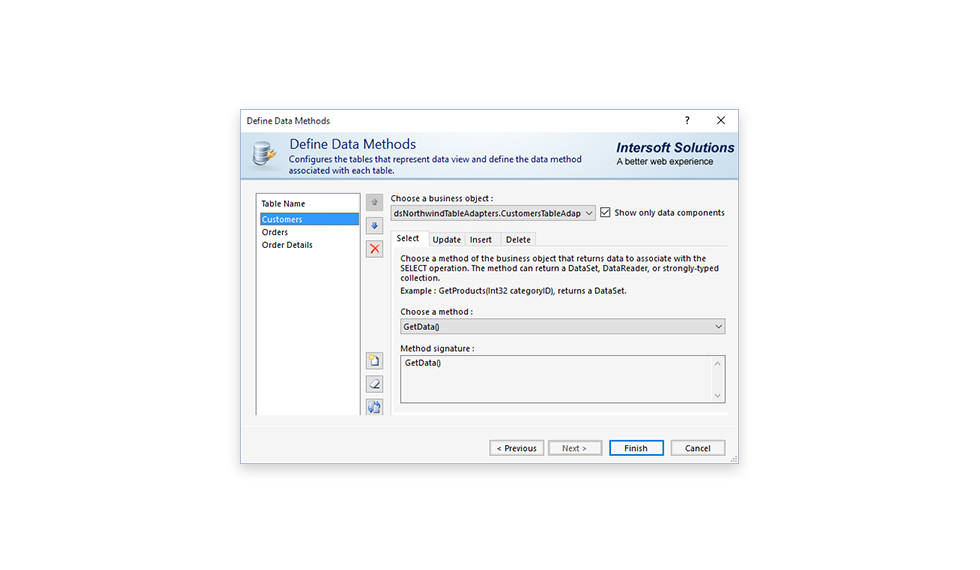 Simplify operations by creating a single composite object to be passed to the Update, Insert and Delete methods. Automatically bind generic collections to .NET controls through an ISDataSource control. Enjoy the extra time on your hands with rapid development time.
