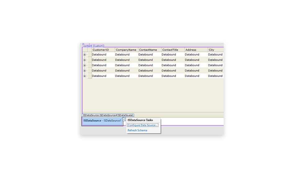 ISDataSource not only supports Intersoft data bound controls, but also extends its power and flexibility to standard ASP.NET databound server controls, such as GridView and FormView. The process of binding to the ASP.NET server controls is just as simple as it is when using the standard .NET data source control.
